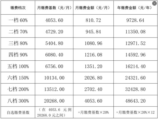 二、灵活就业人员缴费基数怎么定?2024年我区职工基本养老保险按上年全区全口径城镇单位就业人员平均工资81070元(即6756元/月),作为核定缴费基数上下限的指标,其中缴费基数上限为20268元/月,缴费基数下限为4053.6元/月。参加城镇企业职工基本养老保险的无雇工个体工商户和灵活就业人员,可在当年缴费基数上下限内选择相应档次缴费。缴费档次如下图所示。