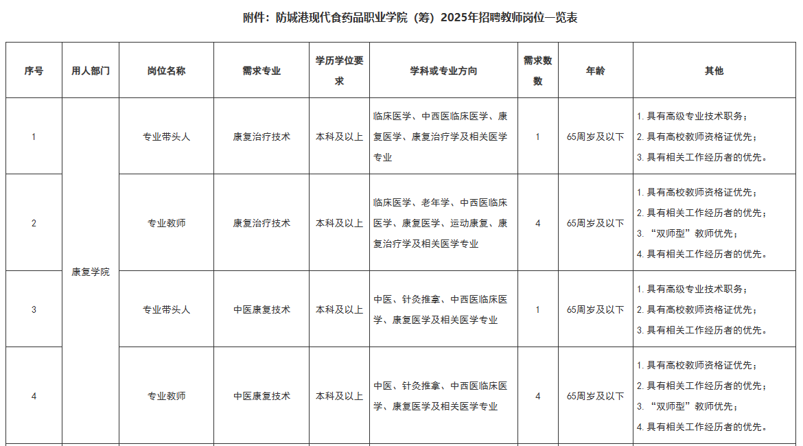 本次招聘教师若干名,具体岗位详见《防城港现代食药品职业学院(筹)2025年招聘教师岗位一览表》