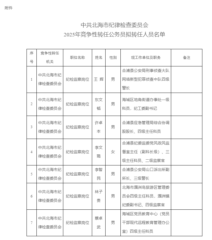 附件:中共北海市纪律检查委员会2025年竞争性转任公务员拟转任人员名单