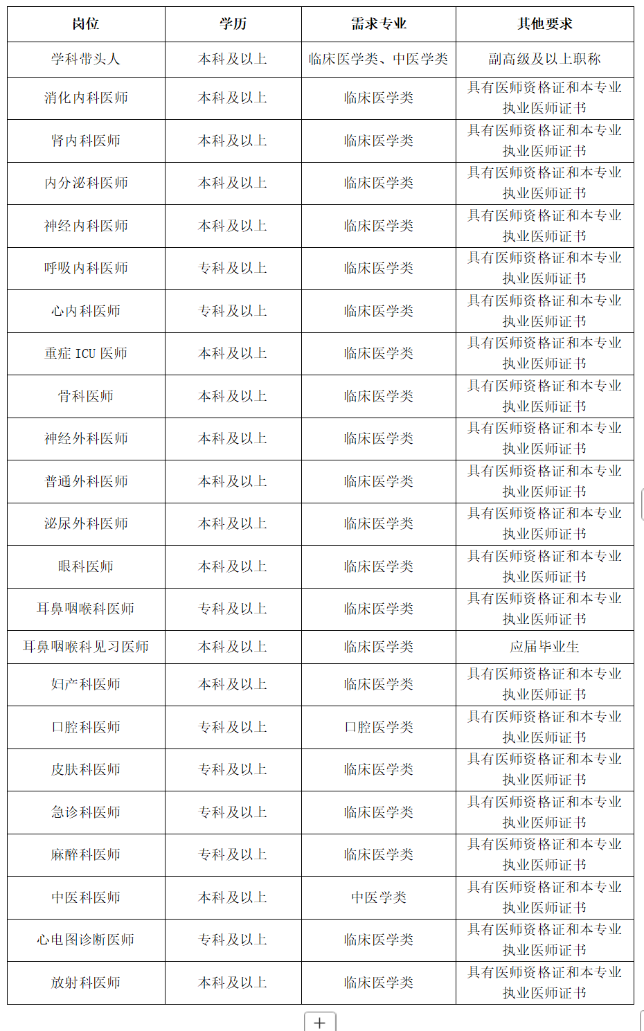 根据我院学科发展需要,现面向社会招聘学科带头人、医师、耳鼻咽喉科见习医师等岗位人才若干名,具体如下: