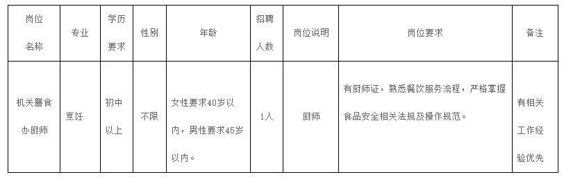 北海市铁山港区机关后勤服务中心因工作需要拟招聘1名厨师在机关饭堂就职。现将有关事项公告如下:
